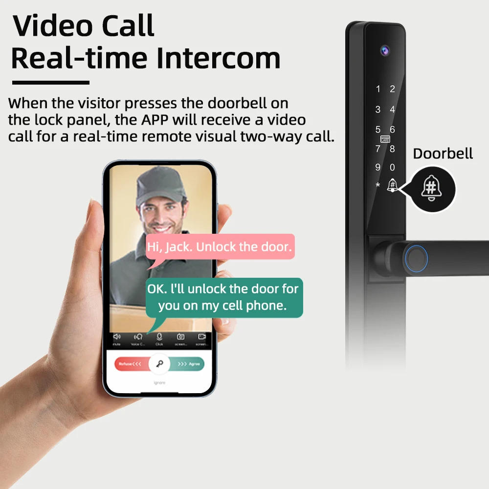 3.مع كاميرا ثقب الباب، ودعم مكالمات الفيديو في الوقت الحقيقي والاتصال الداخلي الصوتي ثنائي الاتجاه وفتح القفل عن بعد لالتقاط الصور، تطبيق Tuya لعرض سجلات فتح القفل بما في ذلك الصور